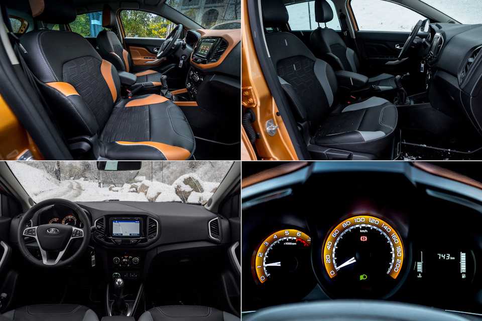 У Лады салон тканевый, имеется бортовик и розетка на 12 вольт, разделение задних сидений 60 к 40 для удобного откидывания для увеличения багажного отсека, в салоне хэтчбек добавляется зеркало в пассажирском козырьке.