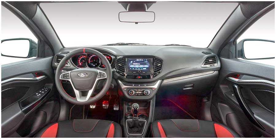 Передние кресла с ярко выраженной боковой поддержкой получили специальную отделку: красные вставки на сиденьях из материала типа алькантара с нанесенной на них »ИКС-графикой» соседствуют с орнаментом »под карбон» на экокоже с красной контрастной отстрочкой. Взаимное дополнение четырех типов материала и текстур, использованных в отделке, добавляет интерьеру контрастности и неповторимости. На спинках сидений под подголовниками вышит логотип Vesta Sport.