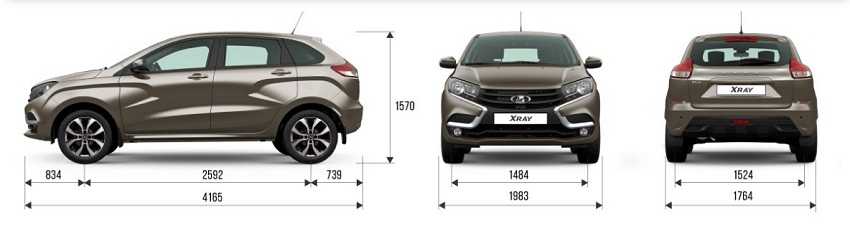 Lada xRay по длине составляет 4165 мм, по ширине 1764 мм, а по высоте 1570 миллиметеров (подбробнее о размерах читайте в статье Лада икс рей размеры).